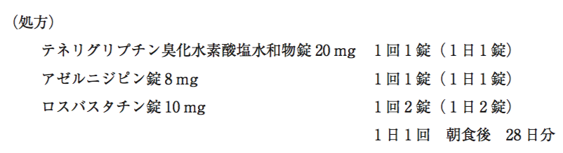 53歳男性。2型糖尿病、高血圧症及び高コレステロール血症(非家族性)のため、生活習慣の改善に加え以下の処方による治療を行っている。しかし、LDL–Cの改善が認められたものの、そのコントロールが不十分なので処方の追加について医師から薬剤師に相談があった。