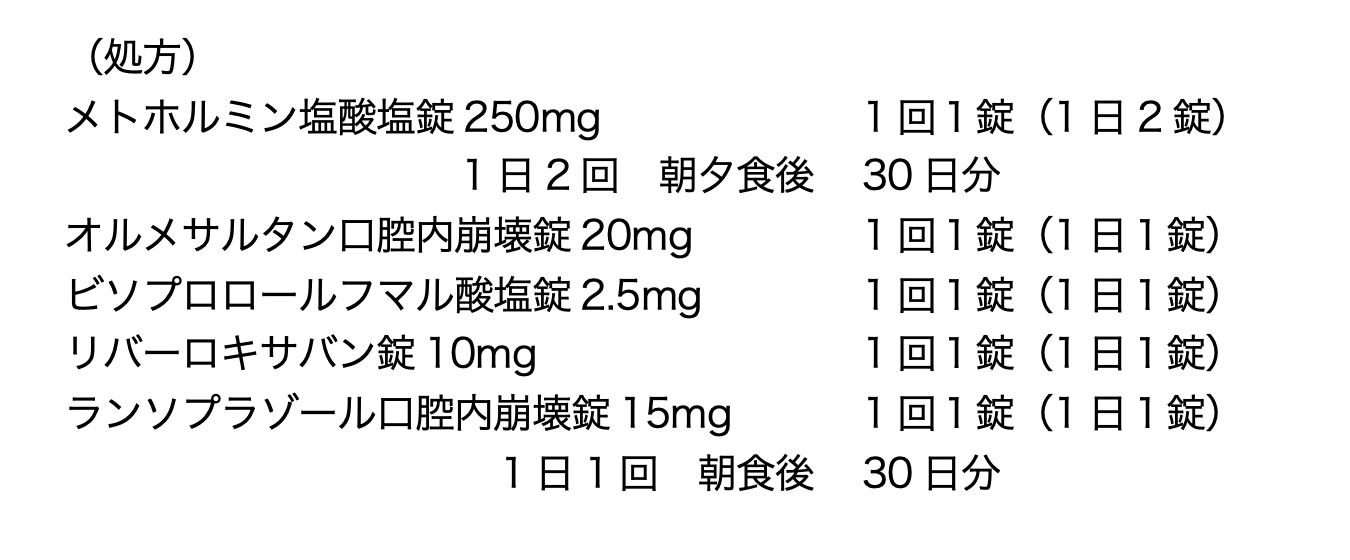 67歳女性。身長156cm、体重52kg。2型糖尿病、持続性心房細動及び高血圧症で自宅近くの病院に通院し、以下の薬剤を服用している。15日前の定期受診時の血清クレアチニン値は0.92mg/dL、eGFR47.0mL/min/1.73m2であった。気温30°C以上の中、庭の草刈りを行っていたところ、頭痛とめまいの症状が出てきたため、今回来院した。そこで、脱水症と診断され、入院して酢酸リンゲル液を投与することとなった。