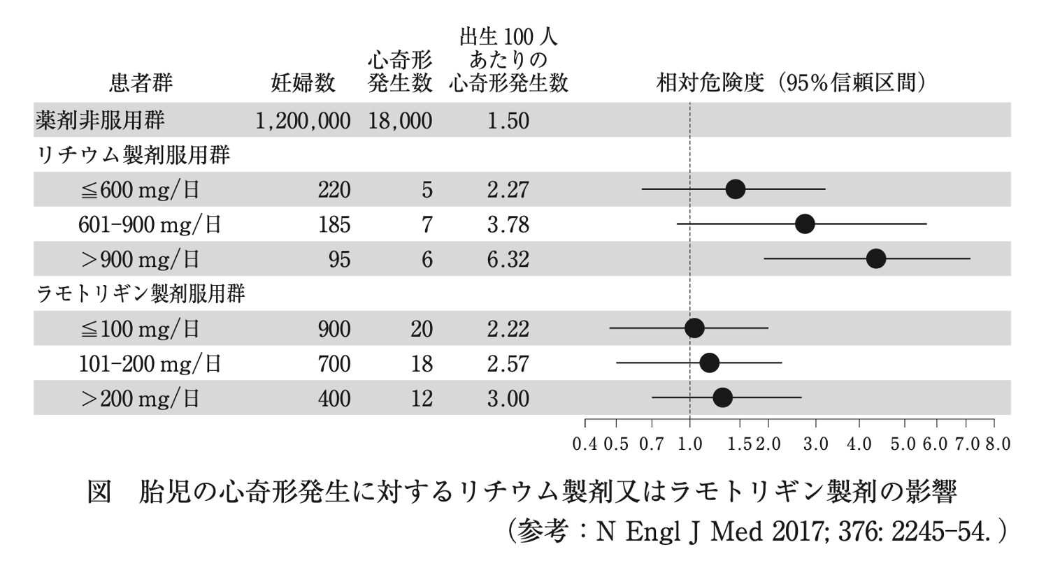 - リチウム製剤服用量が1日900mgを超える群では、出生100人あたり6.32人に心奇形が発生しています。