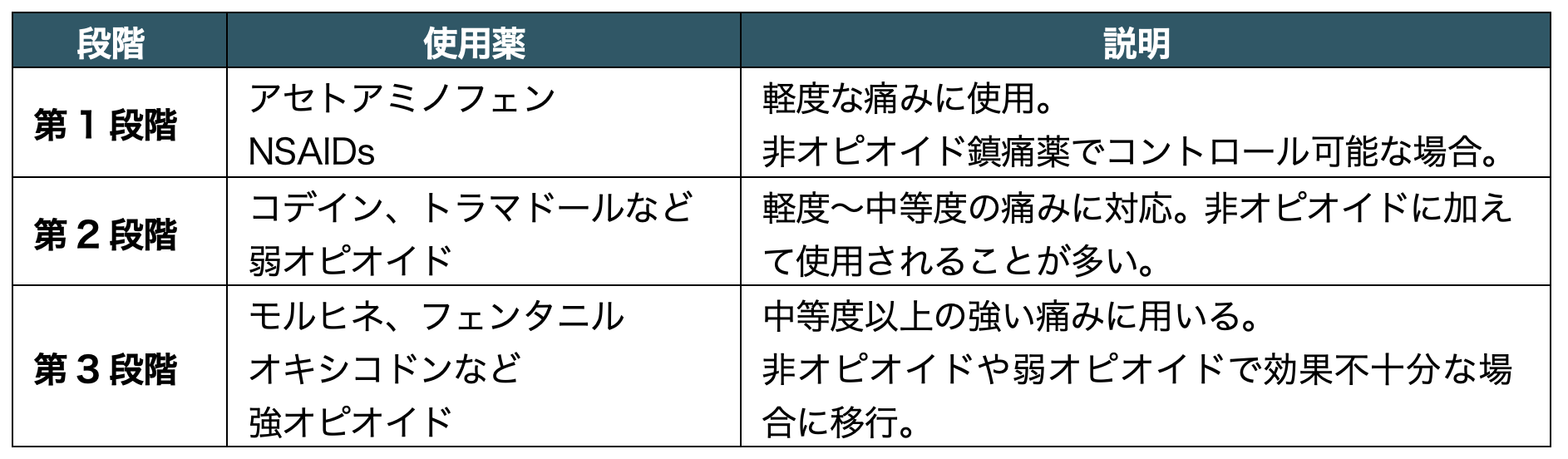 がん性疼痛に対する鎮痛薬の選択と使用方法には、痛みの程度に応じて段階的に治療を進めるWHO三段階除痛ラダーがある。これはWHOが提唱するがん性疼痛の標準的な治療指針である。