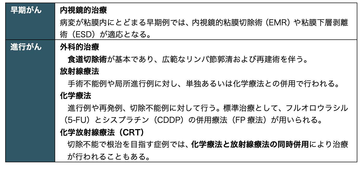 ただし、発見時にはすでに局所進行または遠隔転移を認める例が多く、切除可能な症例は限られている。そのため、手術不能例や再発例に対しては化学療法や放射線療法が選択される。