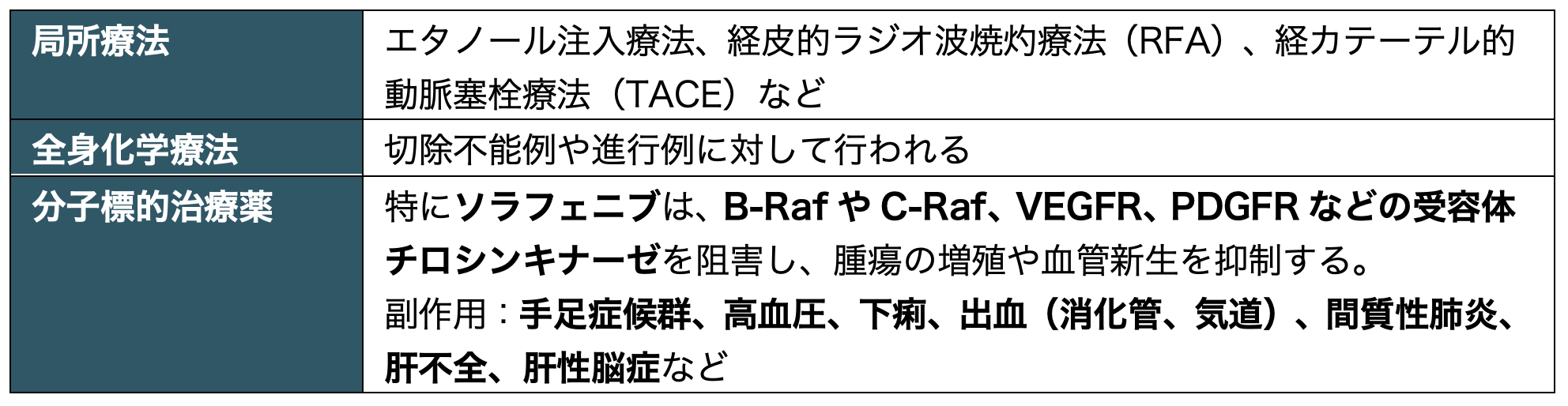 治療法の選択は、腫瘍の大きさ、数、血管浸潤の有無、肝機能(Child-Pugh分類)などをもとに決定される。