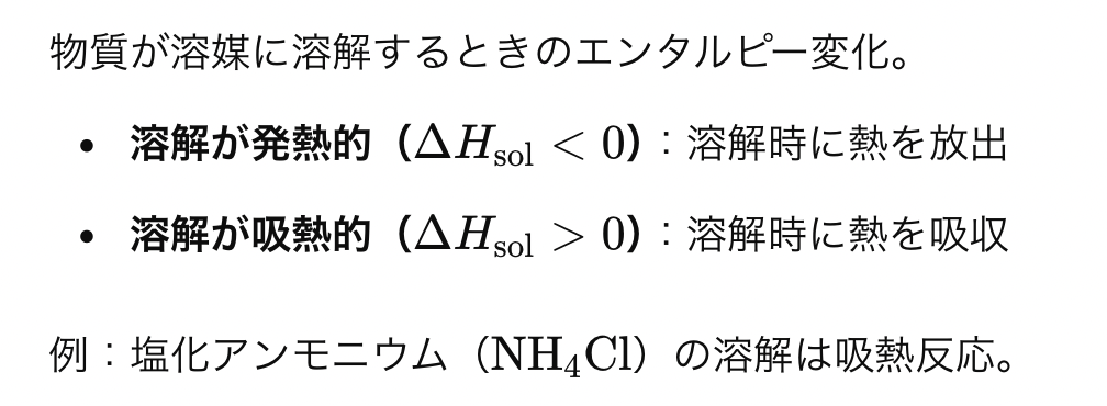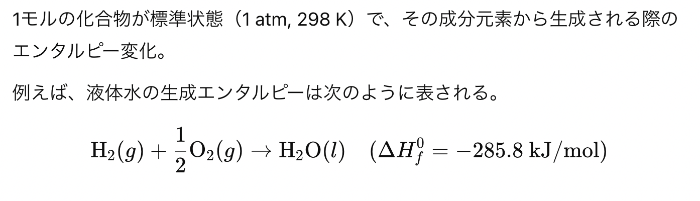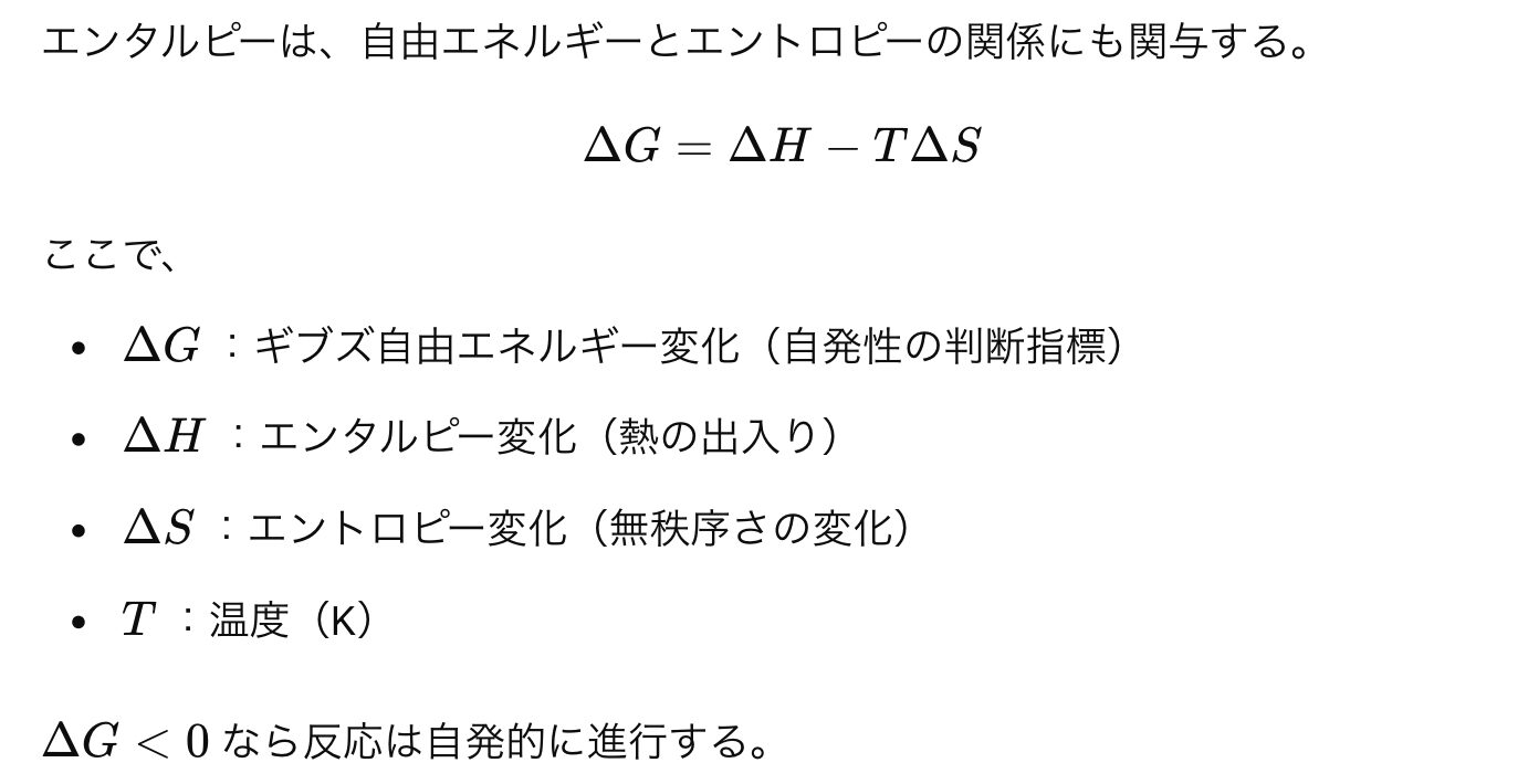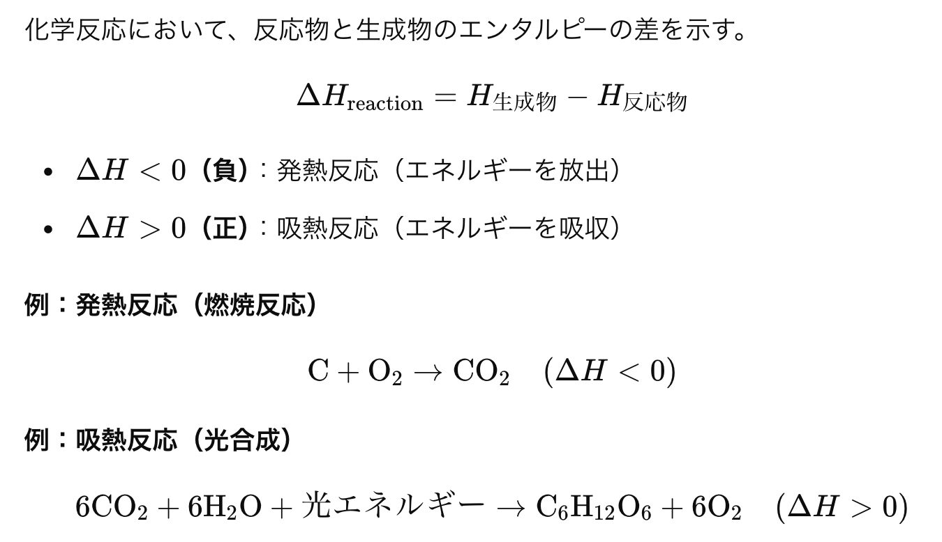 - 化学反応、相転移(融解、蒸発など)、生物学的プロセスにおけるエネルギー変化を記述するのに用いられる。