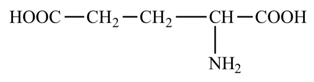 - グルタミン酸は、アミノ基(-NH2)、カルボキシル基(-COOH)、および側鎖としてもう一つのカルボキシル基を持つ化合物である。