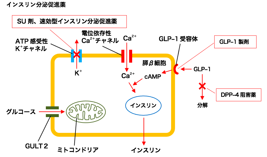 膵β細胞を刺激して、内因性インスリンの分泌を促進することにより、血糖降下作用を発現する。主に、ATP依存性のK+チャネルの遮断による