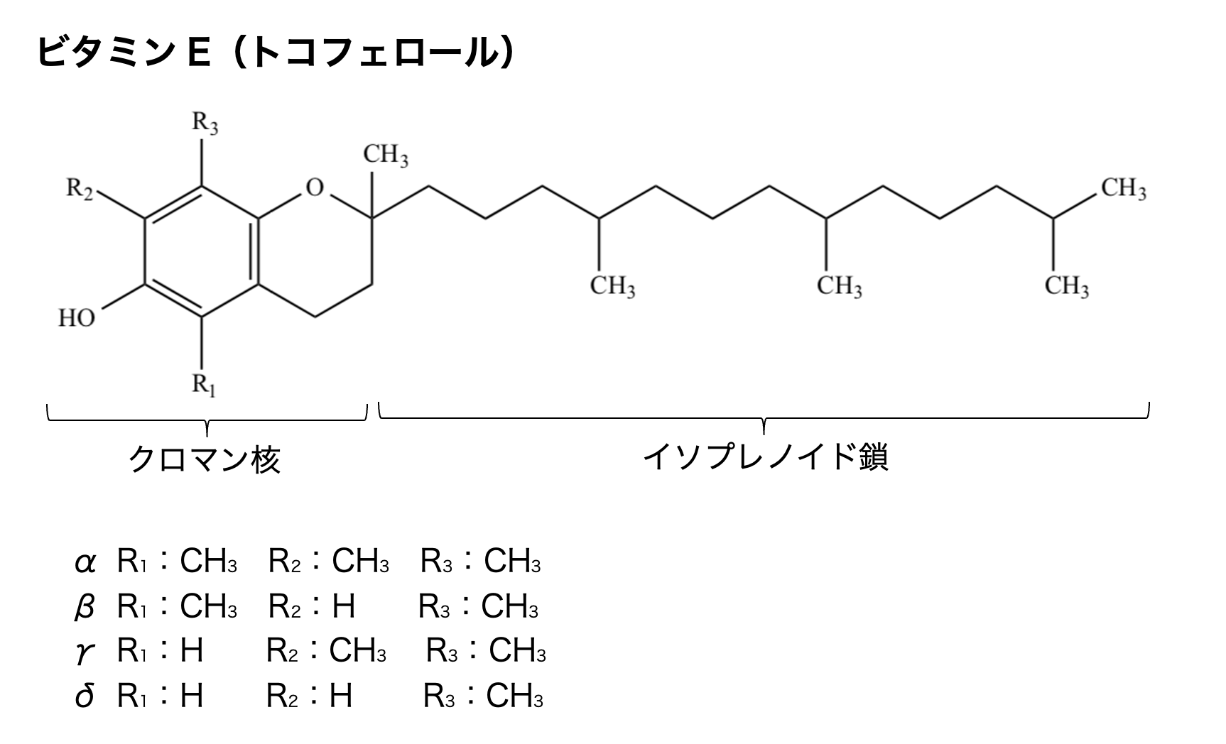 ビタミンEの主成分はトコフェロールと呼ばれ、さらにその構造が異なるいくつかの種類がありますが、最も生理活性が高いのはα-トコフェロールである。