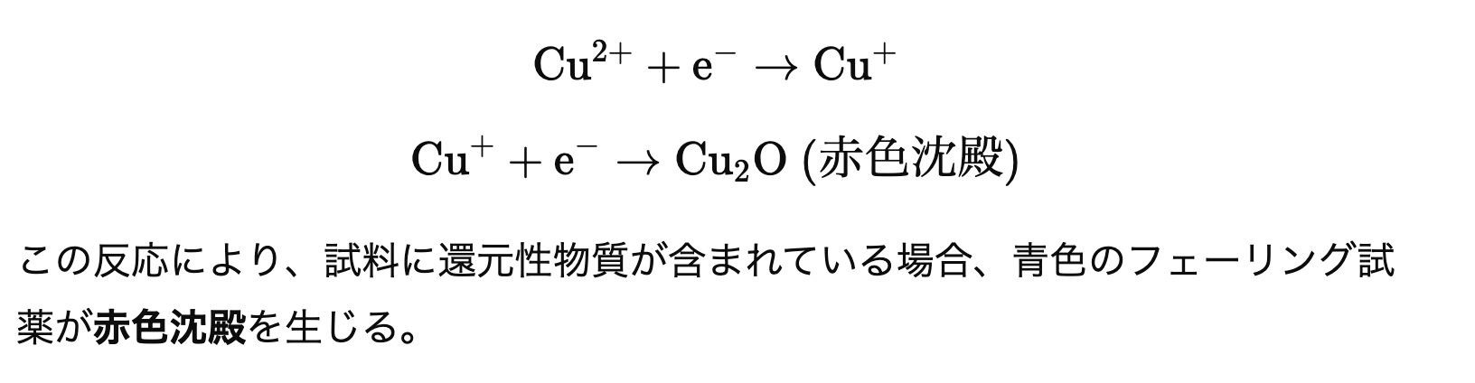 - これは、アルデヒド基()が還元性を持つため、銅(II)イオンを銅(I)イオンに還元することによる。