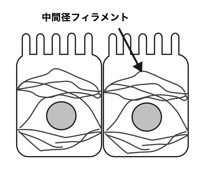 - 細胞の形状維持: 中間系フィラメントは、細胞の形状を維持するための支柱として働く。特に、物理的な圧力や引っ張りに対して安定性を提供し、細胞がその形状を保つことを助ける。
