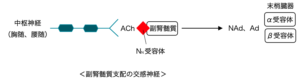 AChが副腎髄質に作用し、そこから NAdやAd(アドレナリン)が分泌されます