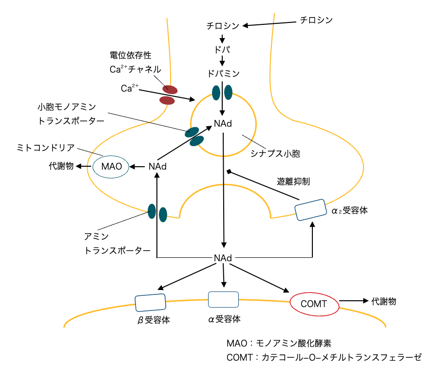 神経終末では、NAdがどのように合成・放出され、作用し、再利用・代謝されるのかを理解しておくことが重要です。