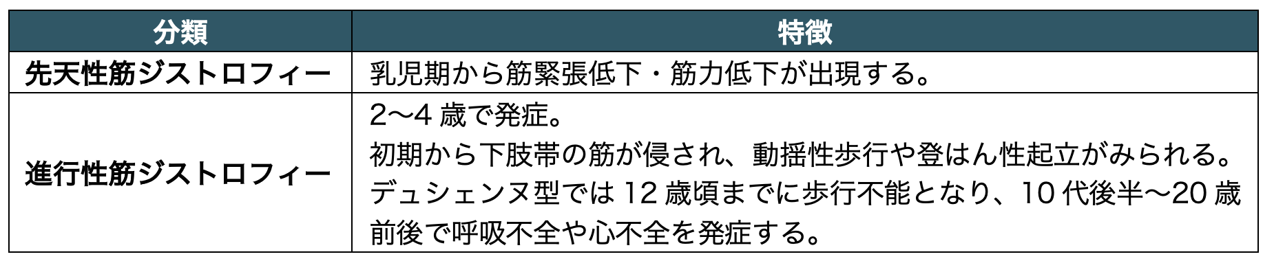 発症時期により、先天性筋ジストロフィー(出生時から症状)と進行性筋ジストロフィー(幼児期以降に症状)に大別される。進行性タイプには、代表的なX連鎖劣性遺伝疾患であるデュシェンヌ型(重症)やベッカー型(軽症)があり、いずれもジストロフィン遺伝子の異常によって発症する。