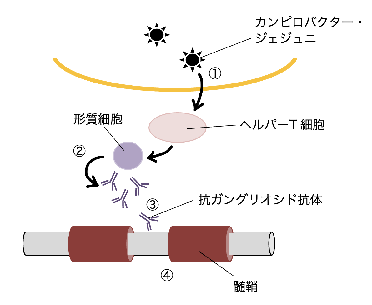 ③:産生された抗ガングリオシド抗体が末梢神経の髄鞘や軸索に結合