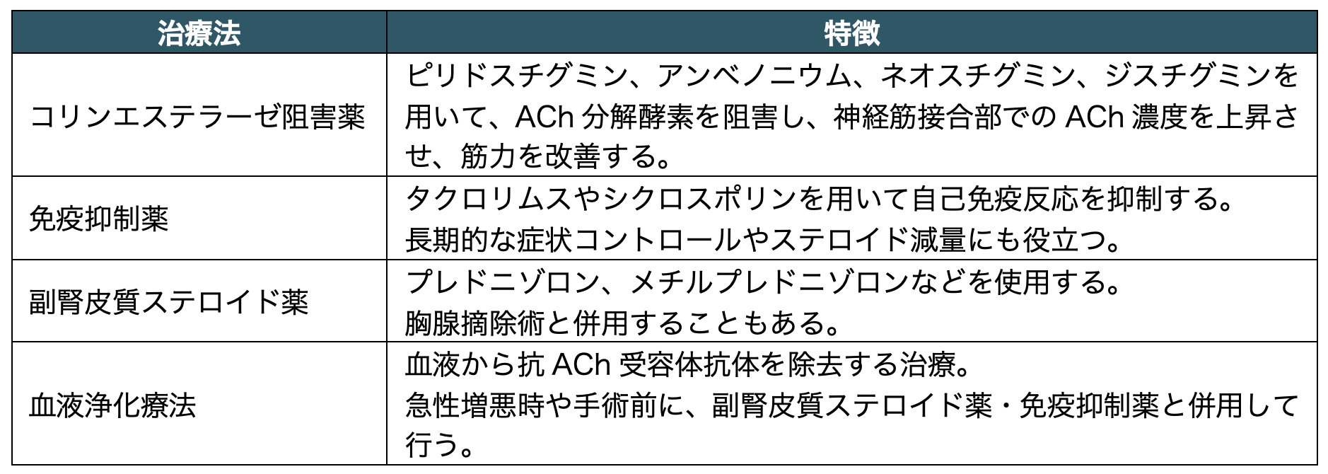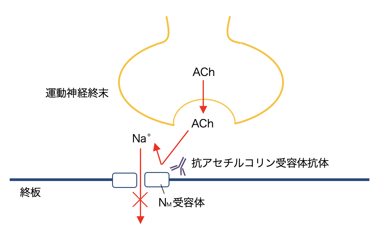 重症筋無力症は、神経筋接合部シナプス後膜に存在するニコチン性アセチルコリン(ACh)NM受容体に対する自己抗体(抗ACh受容体抗体)が産生されることで発症する自己免疫性疾患である。
