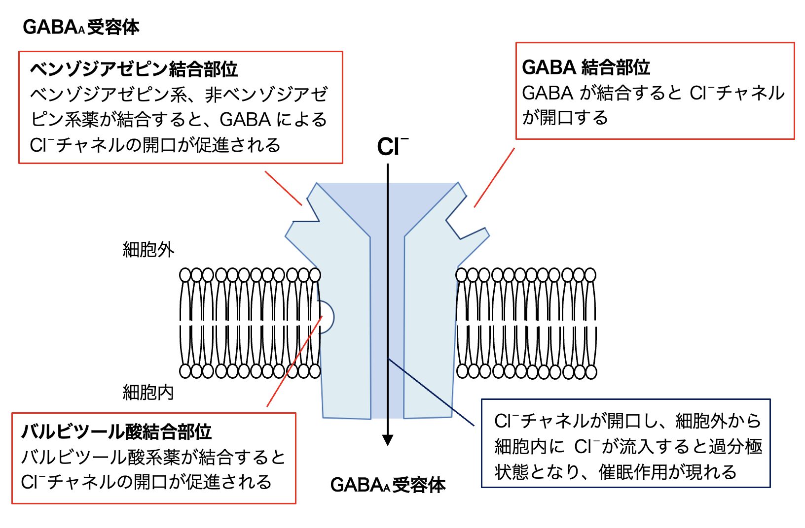 多くの催眠薬は、抑制性神経伝達物質GABA(γ-アミノ酪酸)が結合するGABAA受容体を介して作用する。GABAが受容体に結合するとCl⁻チャネルが開き、陰イオンが細胞内に流入する。これにより神経細胞内の膜電位がより負に傾く(過分極)ため、活動電位が発生しにくくなり、神経活動が抑制される。