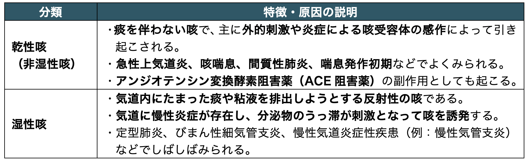 咳とは、気道に入り込んだ異物や過剰な分泌物(痰など)を排除するために起こる、生体の防御的な反射である。通常は一時的な現象であるが、持続的にみられる場合は、上気道の炎症や気道の過敏状態、あるいは特定薬剤の副作用が関与する可能性がある。