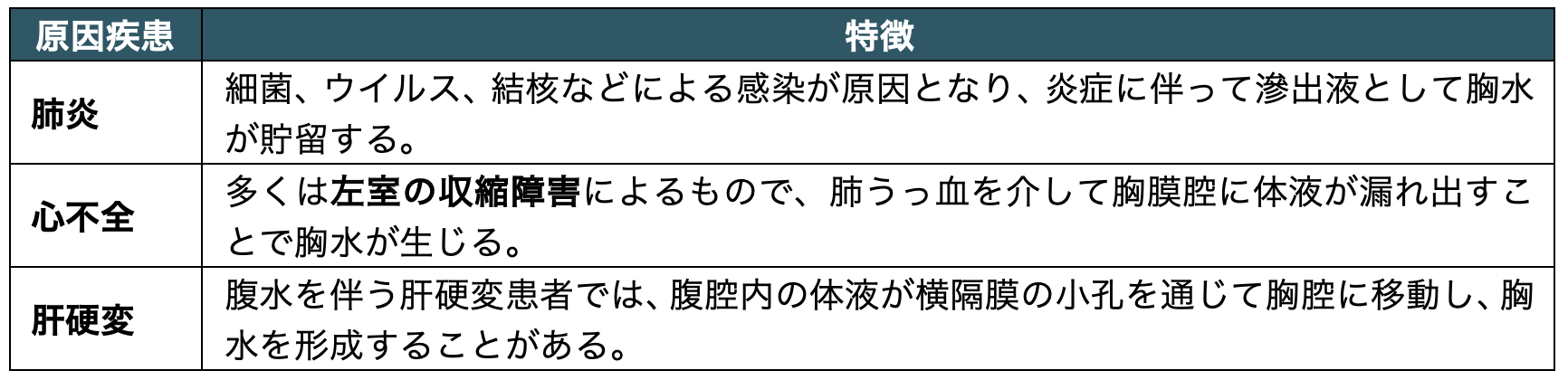胸水とは、胸膜腔に液体が過剰に貯留した状態を指す。通常、胸膜腔にはごく少量の液体が存在し潤滑の役割を果たすが、疾患によって体液の産生と吸収のバランスが崩れると、大量の液体が蓄積し、呼吸困難や胸部圧迫感を引き起こすことがある。