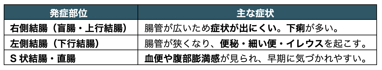 がんの発生部位によって、現れる症状は異なる。右側は無症状のことが多く、左側や直腸は早期に症状が出やすい。