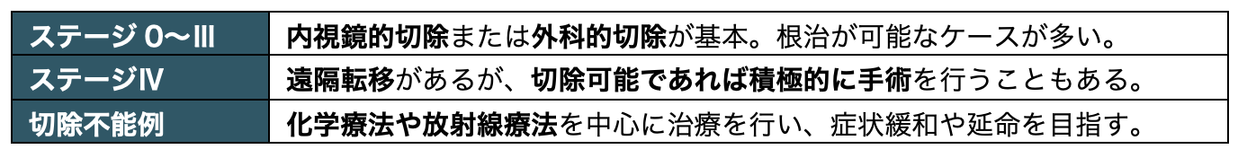 ステージごとに治療方針が大きく異なり、手術の可否や補助療法の有無がポイントとなる。