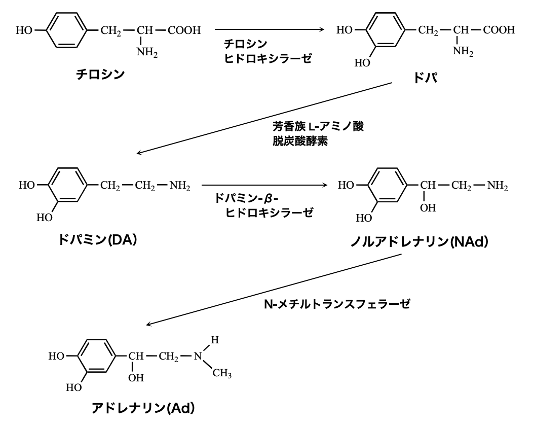 交感神経系や中枢神経系において重要な役割を果たす神経伝達物質に「カテコールアミン」があります。カテコールアミンとは、ドパミン(DA)・ノルアドレナリン(NAd)・アドレナリン(Ad) などの総称です。これらはL-チロシンを出発物質とし、一連の酵素反応によって合成されます。