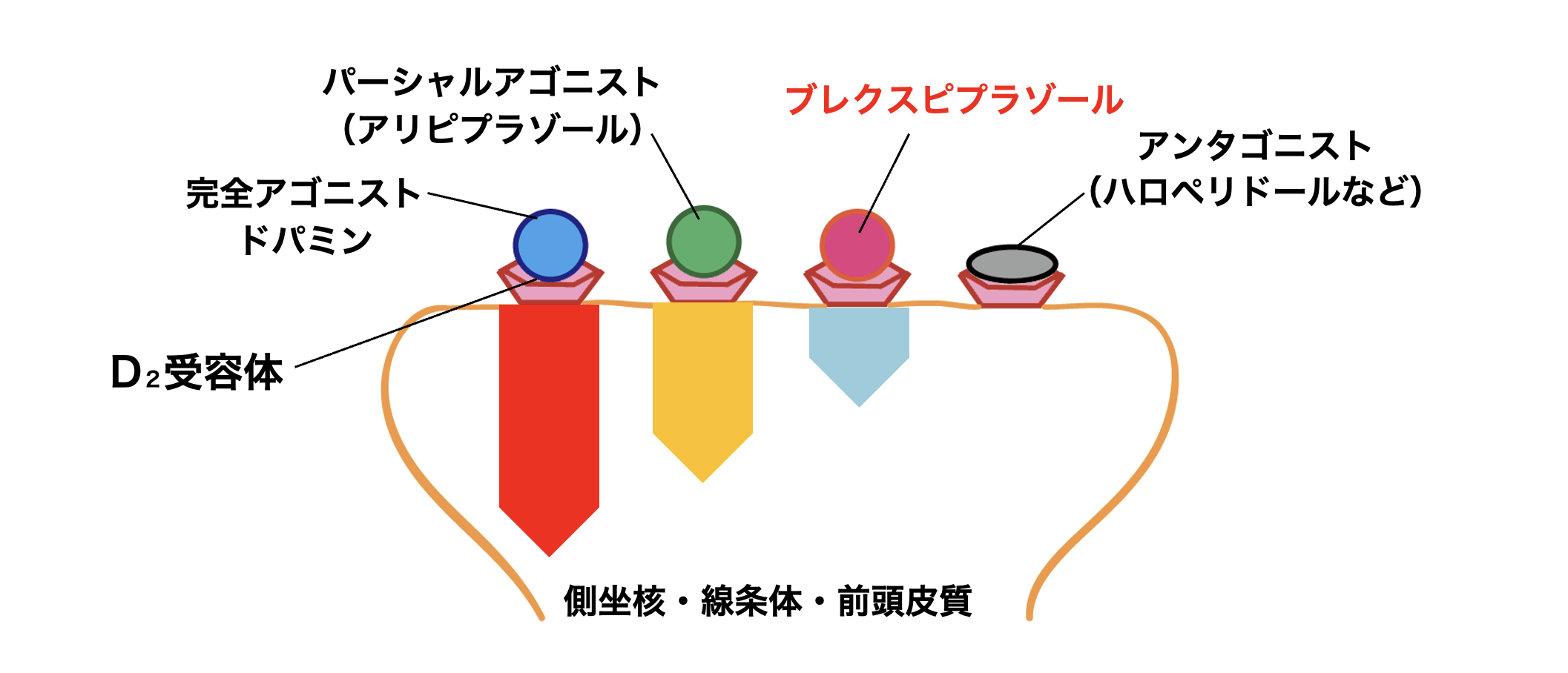 アリピプラゾールは、ドパミンD2受容体部分アゴニスト作用、ドパミンD3受容体部分アゴニスト作用、セロトニン5-HT1A受容体部分アゴニスト作用及びセロトニン5-HT2A受容体アンタゴニスト作用を併せ持つ薬剤である。