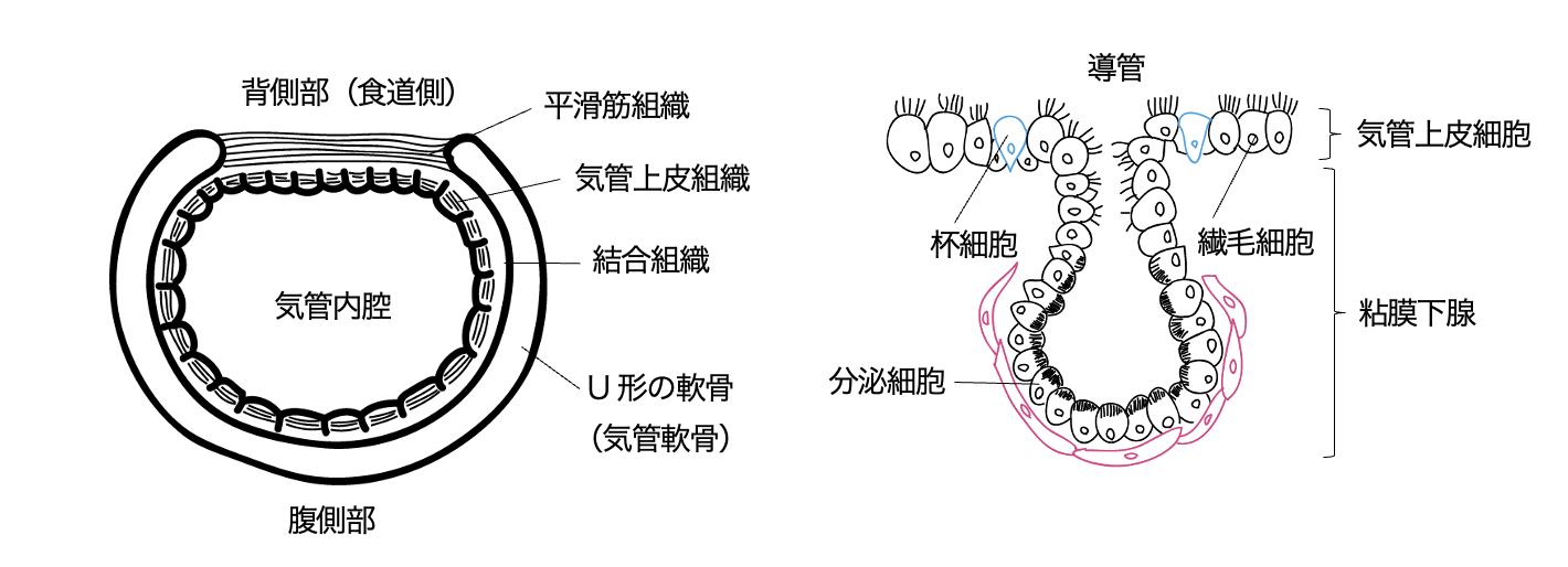気管の内部を覆っている粘膜には、多くの繊毛細胞と杯細胞が存在しており、繊毛細胞は粘液、異物を咽頭側に運び出す役割を担っている。