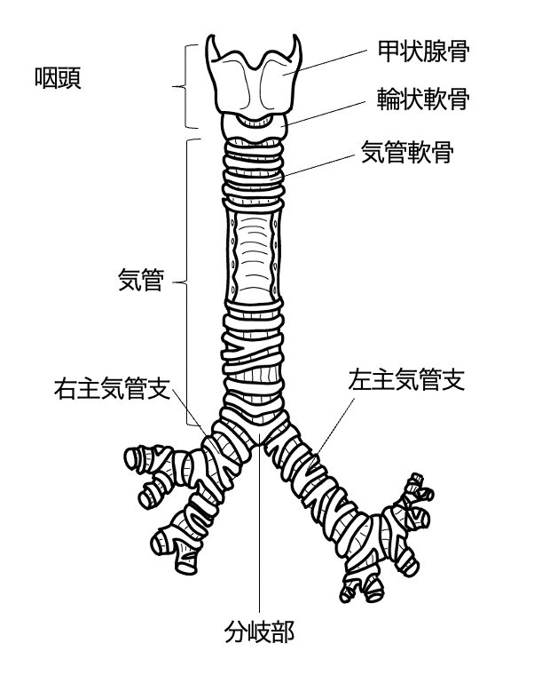 気管は右主気管支、左主気管支に分枝する。右主気管支は左主気管支に比べ、太く垂直に近い角度で肺に向かっているため、右主気管支の方が、左主気管支より異物が侵入しやすく誤嚥を起こしやすい。それに対して、左主気管支は細長く緩い傾斜を保ちながら肺に到達する。
