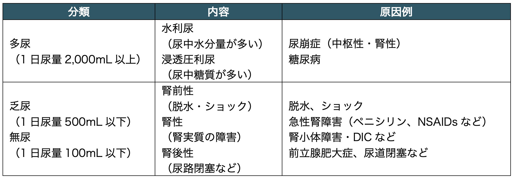 この排尿量が極端に多い状態を「多尿」、極端に少ない状態を「乏尿」や「無尿」と呼ぶ。