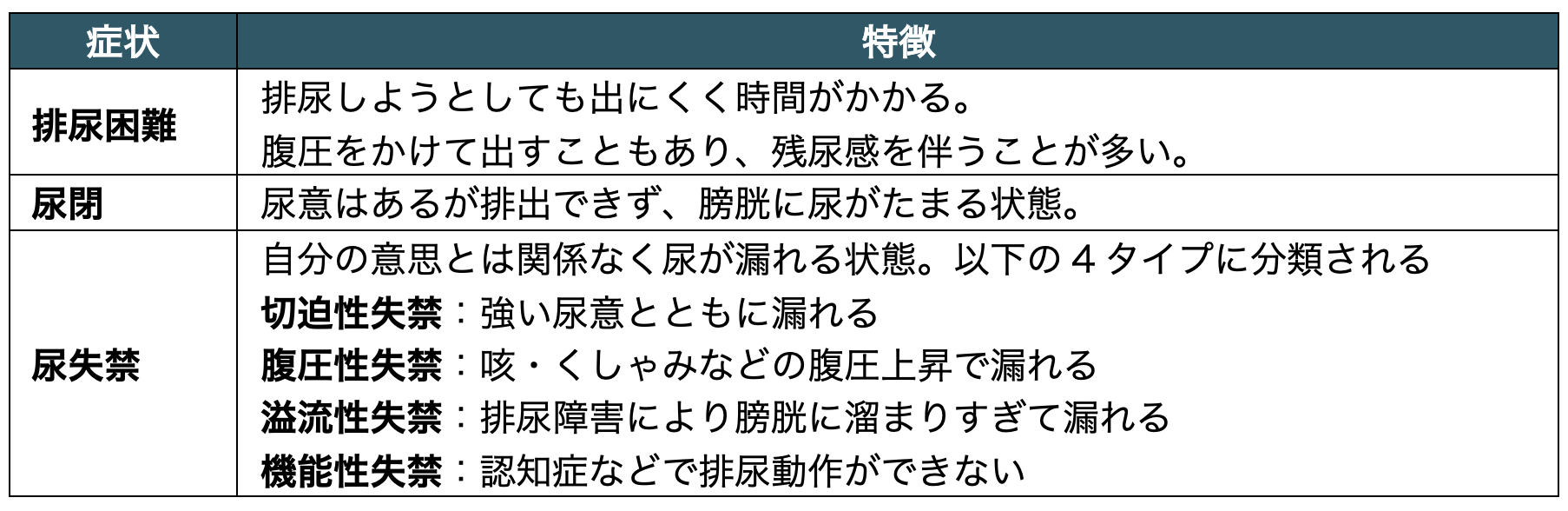 排尿に関する機能的あるいは器質的障害によって、排尿に支障が生じた状態を指す。