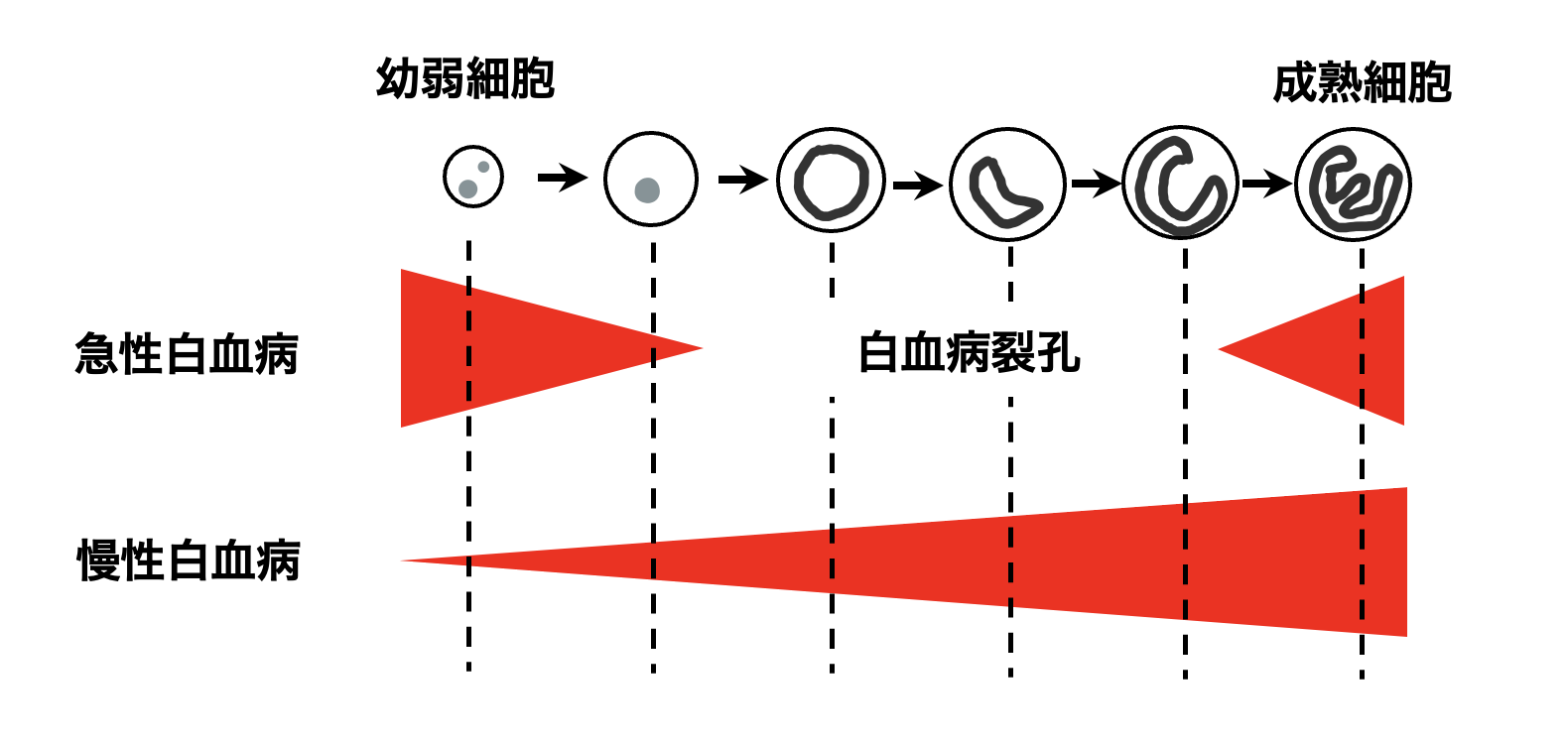 また、急性と慢性の違いは、症状の経過時間ではなく、白血球の分化成熟段階のどこで腫瘍化したかによって決まる。
