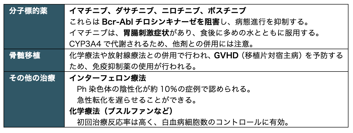骨髄染色体検査でPh染色体陽性(90%以上)を確認することが重要。