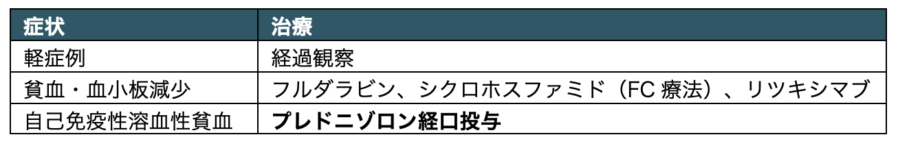 Bリンパ球の腫瘍性増殖により、正常な免疫グロブリンの産生が抑制され、自己抗体の産生による自己免疫性溶血性貧血を伴うことがある。