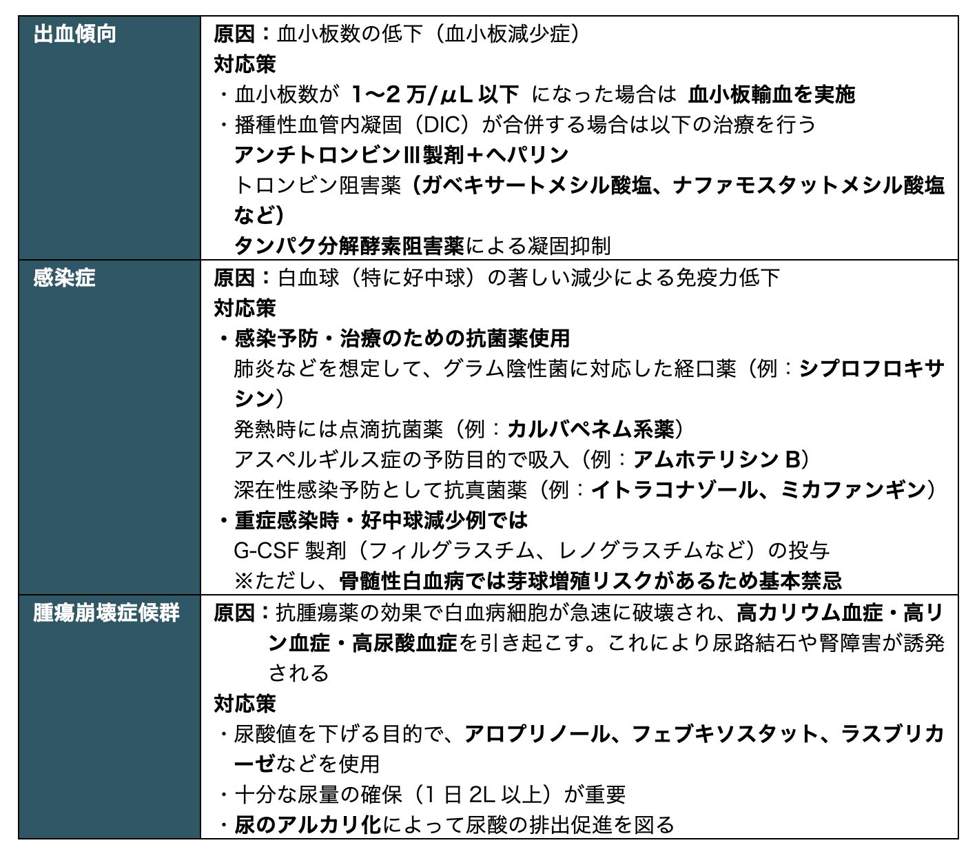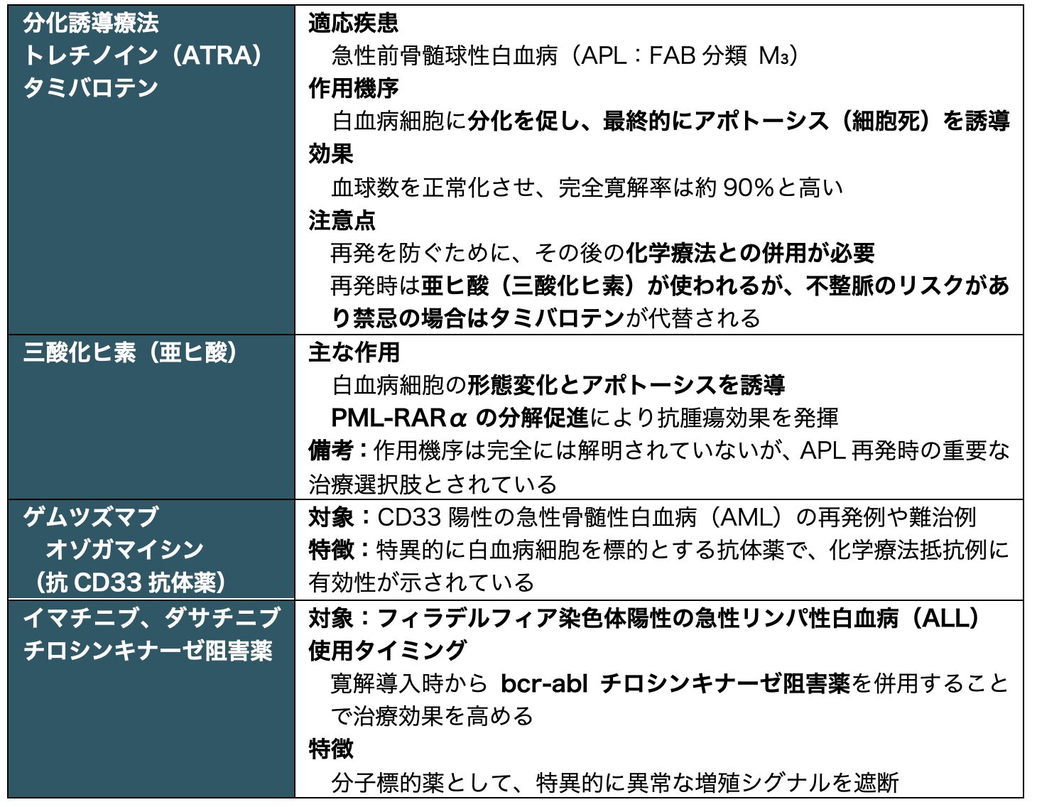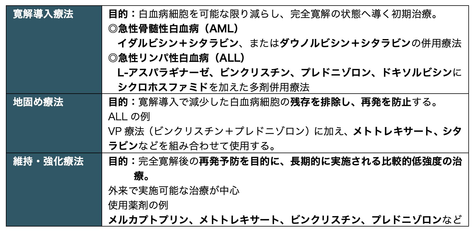 急性白血病の治療では、寛解導入・地固め・維持療法の3段階で治療が行われる。それぞれの段階で目的や使用薬剤が異なる。