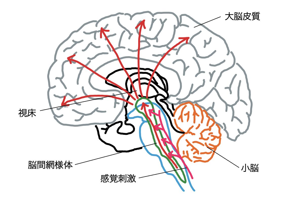 人は一日の中で睡眠と覚醒を繰り返し、体や脳の働きを調整している。覚醒状態を維持するためには、脳内の広い領域を活性化する仕組みが必要で、その中心的な役割を担うのが脳幹網様体である。