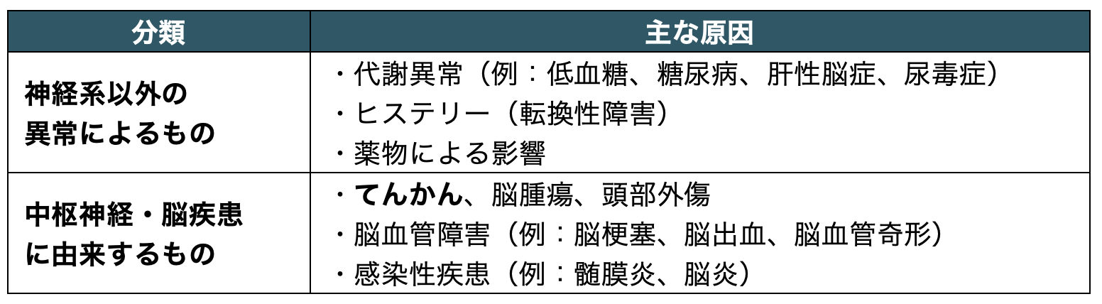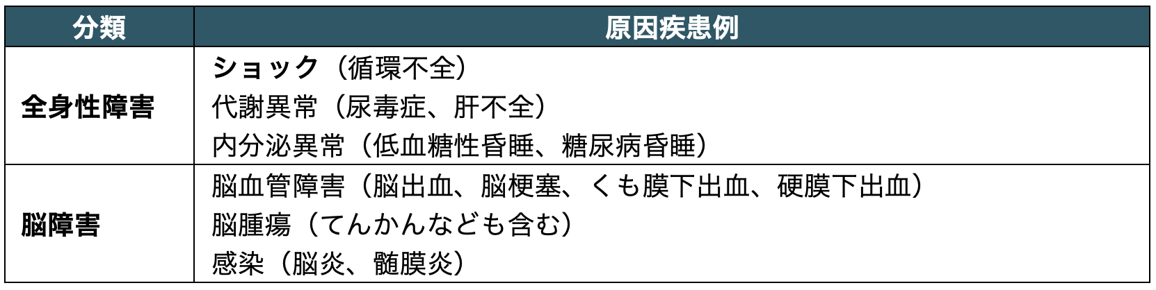 この意識レベルが低下した状態を意識障害といい、臨床的には清明度の低下・傾眠・せん妄・昏迷・昏睡などで判断される。意識障害の原因には、脳の器質的障害や、全身性疾患に伴う二次的な脳機能障害などがある。