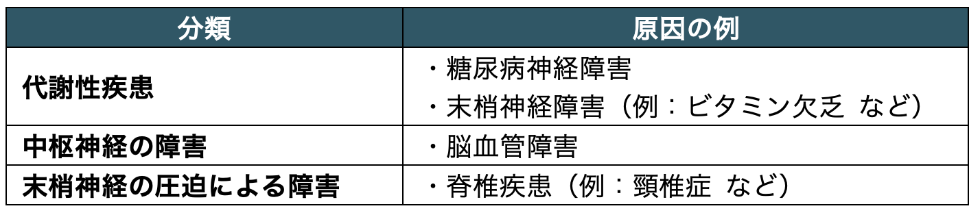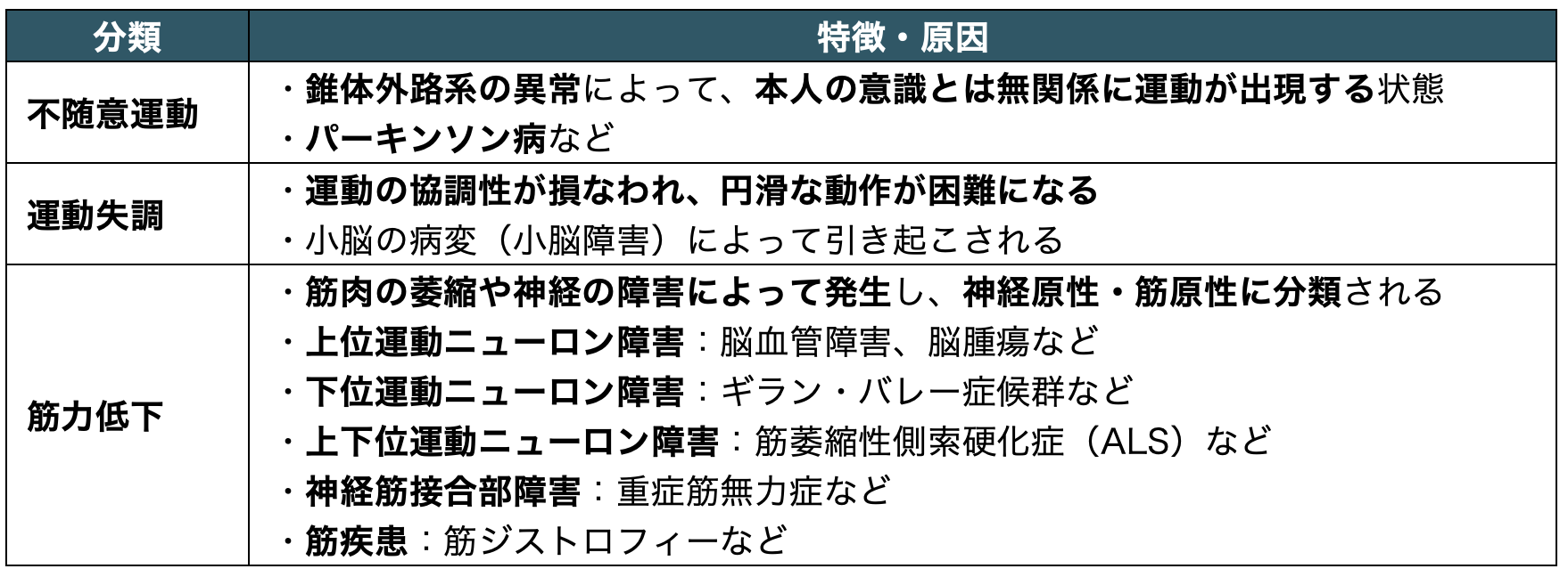 運動障害は、筋力の低下によるもの、不随意運動によるもの、運動の協調不全によるものの3つに大別される。
