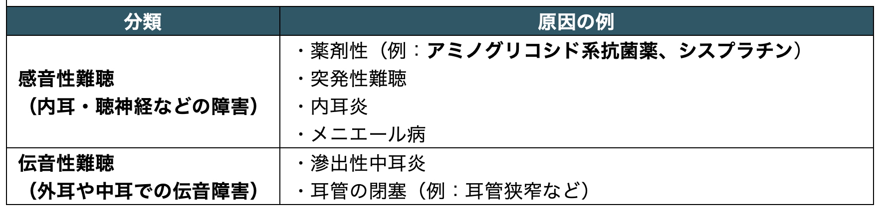 ・感音性難聴:内耳や聴神経、聴覚中枢などの障害
