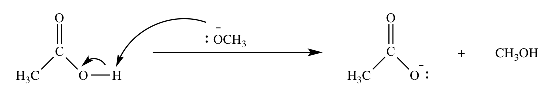 酢酸(CH3COH2)にメトキシドイオン(CH3O−)を反応させると、酸塩基反応が進行し、酢酸イオンとメタノールが生成する。