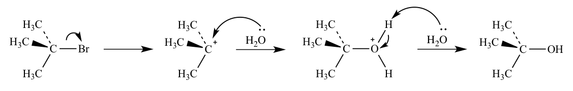 2−ブロモ−2−メチルプロパン((CH3)3CBr)に水を反応させても設問のようなSN2反応は進行しない。なお、2−ブロモ−2−メチルプロパン((CH3)3CBr)に水を反応させると、SN1反応により、2−メチルプロパン−2−オールを生成する。