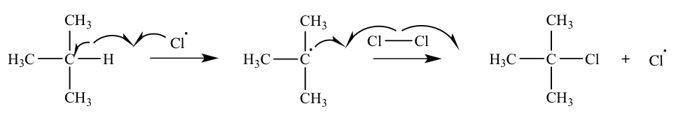 2−メチルプロパンのようなアルカン類における炭素−水素結合は容易に開裂しないため、設問のように2−メチルプロパンに塩素を反応させても、2−クロロ−2−メチルプロパンは生成しない。なお、2−メチルプロパンに塩素ラジカルを反応させると、2−クロロ−2−メチルプロパンが生成する。