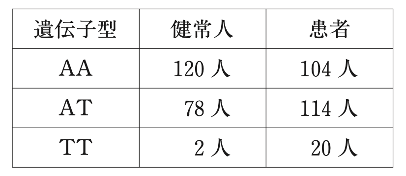 ある疾患を有する患者と健常人から得られたゲノムDNAを使用し、疾患原因の候補遺伝子の一塩基多型(SNP)と疾患との関連について検討したところ、下記の結果を得た。この疾患の発症に関して、遺伝子型TTの、その他の遺伝子型に対するオッズ比に最も近い値はどれか。1つ選べ。