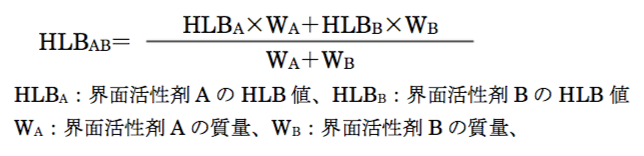 - HLB値が3.7の界面活性剤2 gと、HLB値が11.5の界面活性剤1 gを混合して得た界面活性剤のHLB値は、7.6である。