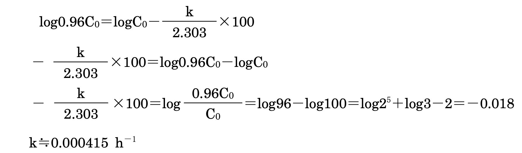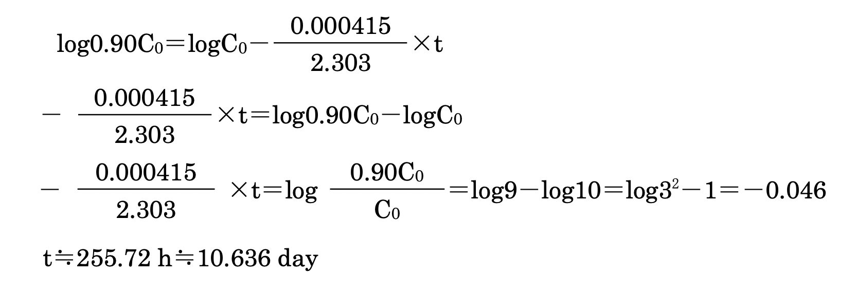 ある液剤を25℃で保存すると、1次速度式に従って分解し、100時間後に薬物含量が96.0%に低下していた。この薬物の有効性と安全性を考慮すると、薬物含量が90.0%までは投与が可能である。この液剤の有効期間は何日か。1つ選べ。ただし、log2=0.301、log3=0.477とする。