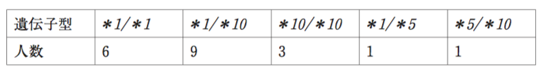 20名の被験者において、CYP2D6の遺伝子型を解析したところ、以下の結果が得られた。