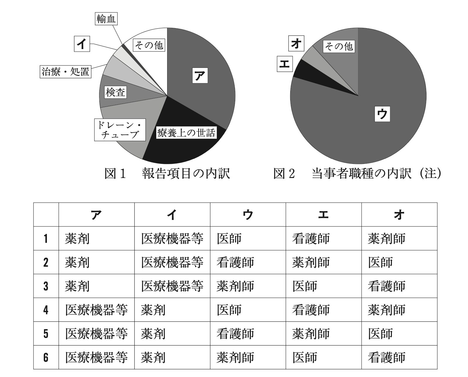 処方された薬剤の用量を誤って調剤した場合、医療事故につながる可能性がある。下図は、公益財団法人日本医療機能評価機構で収集した医療機関におけるヒヤリ・ハット事例の報告件数に基づいて作成されている。図のア〜オに入る語句として適切なのはどれか。1つ選べ。なお、この報告件数には以下の①〜③に該当する事例が含まれている。