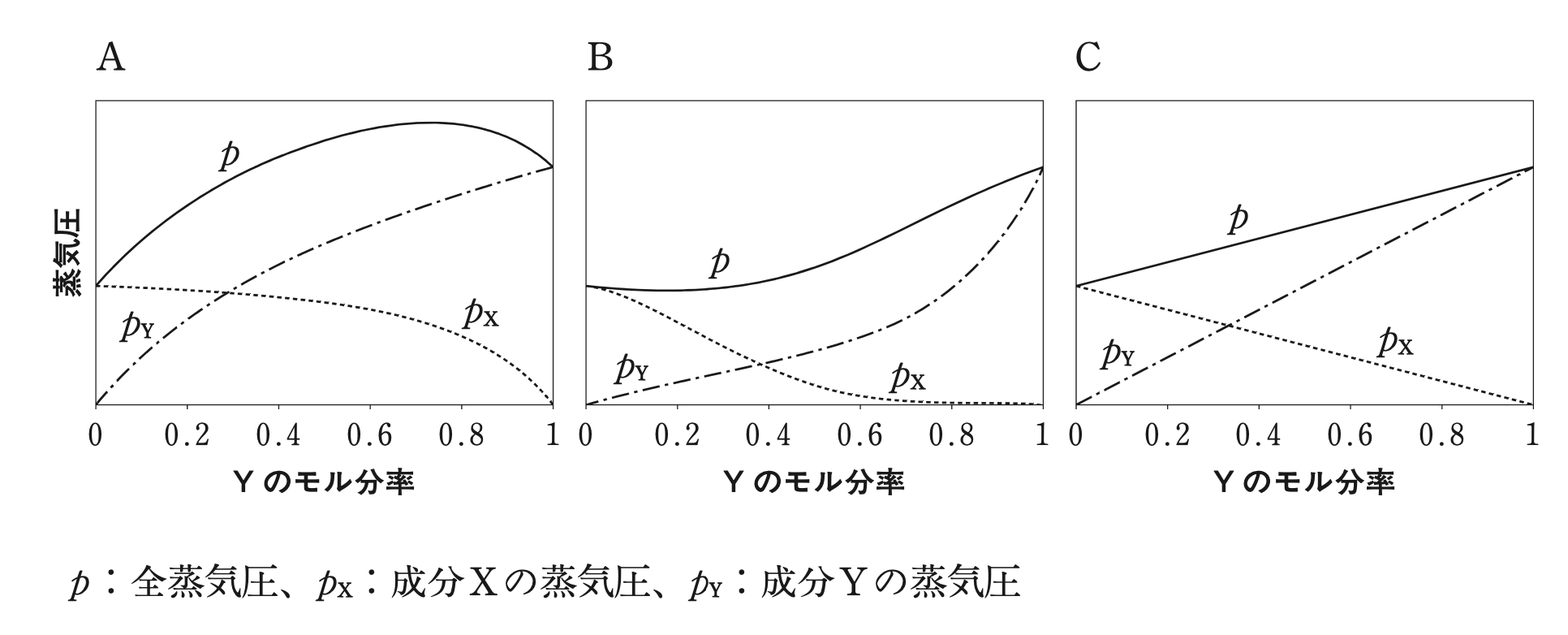 設問に「成分X、Yが理想溶液とみなせず、XとYの分子間相互作用が同種分子間の相互作用よりも弱い場合」とあることから、XとYを混合すると活量係数が1より大きくなり、Aのようなグラフになる。