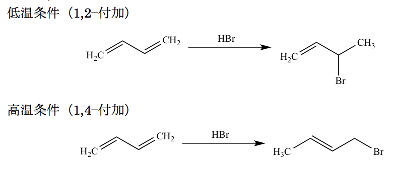 ブタ−1,3−ジエンに高温条件又は低温条件で臭化水素を付加すると以下の反応が進行する。
