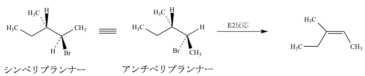 E2反応では脱離する水素とハロゲンが同一平面上で反対方向アンチ(アンチペリプランナー)の関係となる立体配座から進行する。