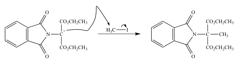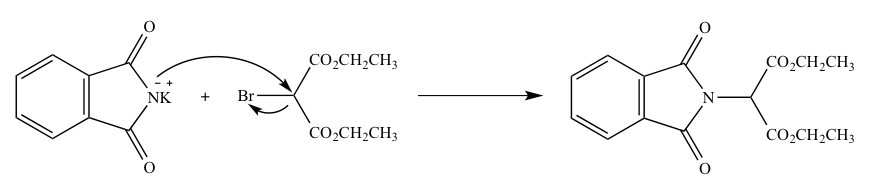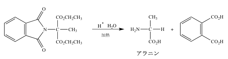 フタルイミド(1,2−ベンゼンジカルボキシイミド)のカリウム塩から生じるアニオンに対して、2−ブロモプロパン二酸ジエチルを反応させるとN−置換フタルアミドが生じる。