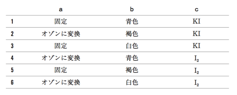 ウインクラー法では、アルカリ性条件下で硫酸マンガンから生じた水酸化マンガンと、試料中のDOが反応することにより、速やかに酸素が( a )され、亜マンガン酸の( b )沈殿を生じる。次に、硫酸を加えることで、DOと当量の( c )が遊離するのでチオ硫酸ナトリウム溶液で滴定し、DOを求める。