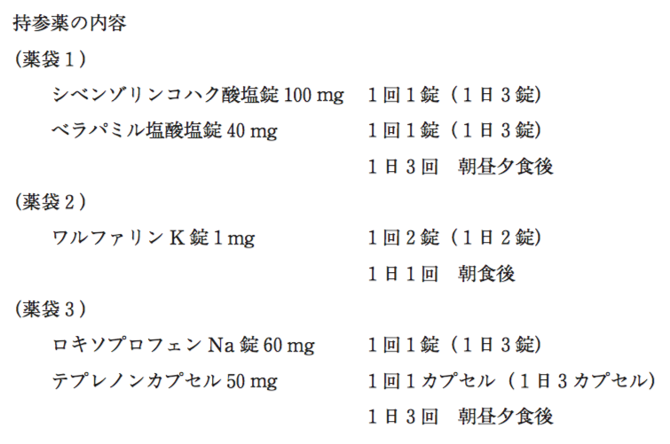 60歳女性。身長150 cm、体重45 kg。めまい、ふらつき、冷汗、軽度の意識障害を主訴として受診し、入院することとなった。入院時に病室を訪問した薬剤師が持参薬を確認したところ、下記の薬剤を日ごろ欠かさず服用していたことが分かった。入院時の血清クレアチニン値1.5 mg/dL、BUN 29 mg/dL、AST 25 IU/L、ALT 30 IU/L、PT-INR 2.0、空腹時血糖値40 mg/dLであった。